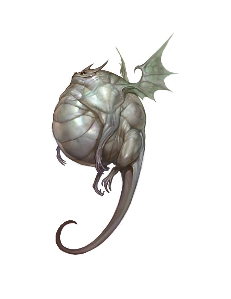 Pearl dragonets have pearlescent scales and a round body with stumpy legs. Their minute wings cannot support flight, so they rely on magic to fly. They have long tails that can be up to five times the length of their bodies. This odd build exacerbates their ungainly, waddling gait, which is punctuated by head-over-heel rolls and erratic flight paths.