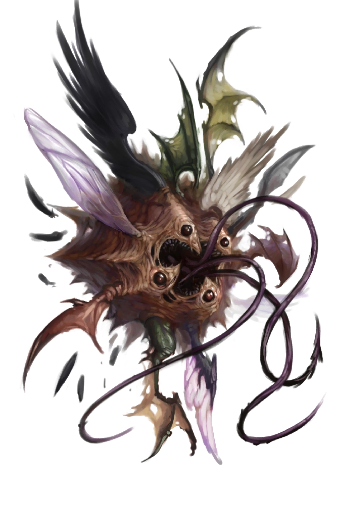 Of all Rovagug's spawn, the creature known as Volnagur is the one that has most distanced itself from the Dead Vault at Golarion's core, instead making its home among the skies. Volnagur possesses many wings, and they're mismatched, asymmetrical, and uncoordinated, yet the massive spawn is capable of powerful flight that carries it as far as Arcadia, Tian Xia, and even Sarusan. Though capable of wreaking great destruction with both its many razor-sharp tongues and powerful blasts of energy from its four eyes, Volnagur's most fearsome ability is the discordant song produced by the precise angling of its wings against the wind, which drives all who hear it to violence, setting neighbor against neighbor.
