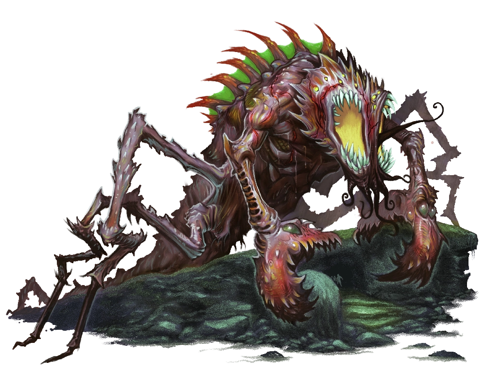 Sorvuth-ka is the youngest of Rovagug's spawn. It has never been seen eating; lacking the ravenous hunger observed in the other Spawn, it seems to destroy simply for the pleasure of it, approaching each of its attacks with novel, inventive cruelty. Sorvuth-ka might pause while destroying a town to give the populace just enough time to flee, only for them to realize in despair that their only route of escape is a mountain pass that Sorvuthka has already collapsed. However, the creature grows bored easily, swiftly dispatching prey with bladed limbs if its games stop going to plan or take too long to come to fruition.