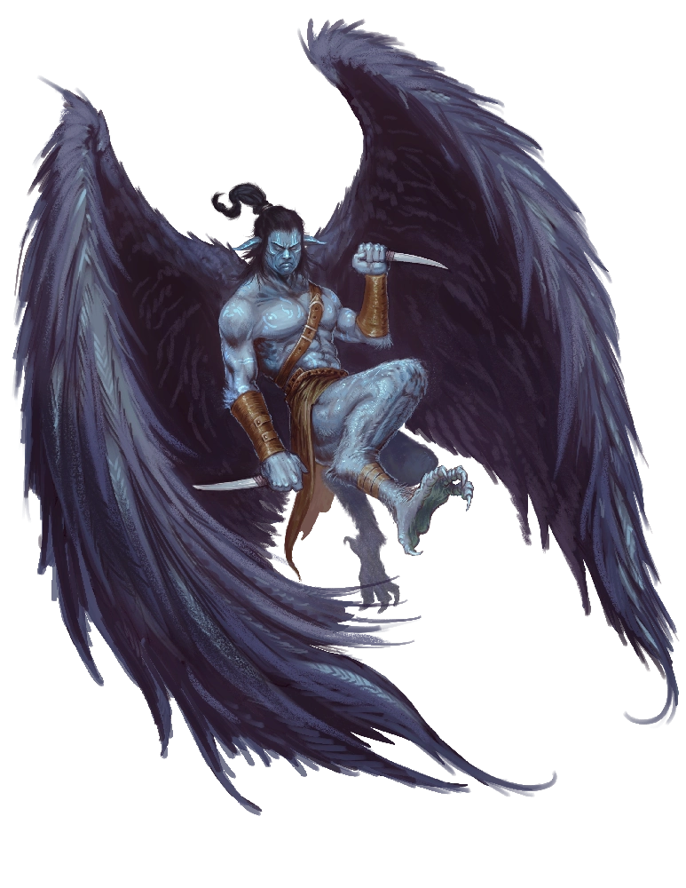 Strix, called itarii in their own language, are avian humanoids with sprawling, dark-feathered wings and large talons. They possess angular features and piercing eyes that are fixed facing forward.